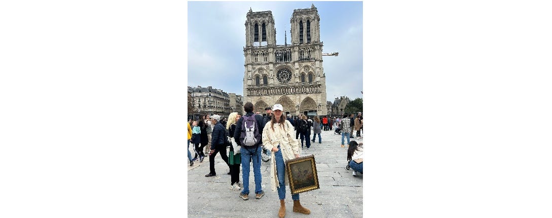 En route home, I walked slowly past our lady, the Notre-Dame. A few women had asked me to take their picture (after a French couple had stopped me, complimented my painting, and then asked me in French where market was so that they could go. I am proud to say that I gave them directions in French and wait for it… they understood me!!!!), after I took their photo they offered to take mine. Porquio pas!!?? I had a beautiful moment to remember after all. This weekend was bliss! So I stood proud with my American-ness practically dripping from me: New York Yankees hat on, Mirth duster draped, hidden LL Bean tote behind me FULL of other goodies, Hanes tee shirt under it all with a pair of American rag and bone denim. hahah I’m talkin’ dripping in American-ness. And yet, feeling French!! The perfect backdrop of Our Lady — the most beautiful and famous French monument, The Notre Dame, with my beautiful French masterpiece. C'était parfait! What a way to end the week!