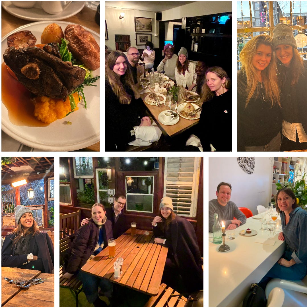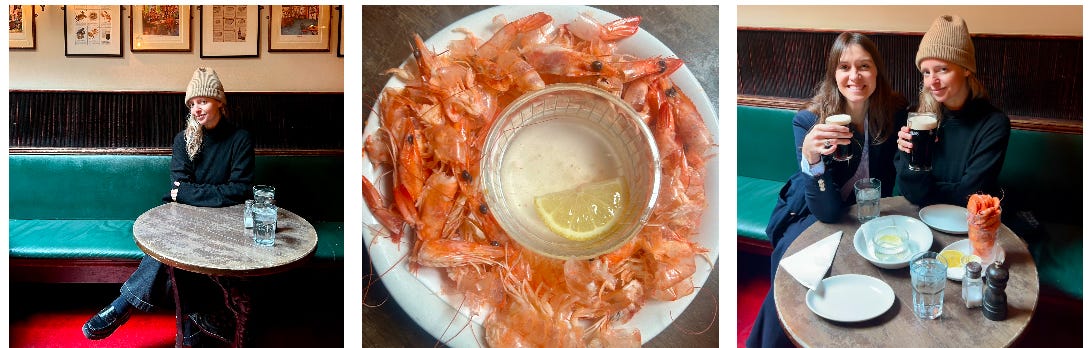 Friday, I arrived in London around 10am and wasted no time hopping on the Underground to White City House. Arriving only a few hours after Erika, who was thriving in her NYC jet-lag state!! We both gabbed for about an hour until our rooms were ready WAY earlier than expected, which was a tailwind, and then we made our way to one of her favorite pubs, The Cow – and my newest obsession. (This will be a must-visit every time I'm in London from now on. In fact, my friend Cara, who used to live in London too many moons ago, also recommended it – so it’s an establishment evidently.) The move? Go with a hungry babe (code for chérie in England) and order it all! We went for a pint of prawns, the full bowl of fish stew (MUST get), and the walnut and beet salad. We washed it down with what else? Two Guinnesses, of course. When at your first pub in London, it’s almost mandatory to order a loaf of bread to drink… oooop… I mean a heavy stout.