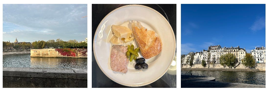 This evening I got to explore the Island, stock my kitchen, walk to the market for Rhillette (not nearly as good as the Rhillette in Ponthoile, and buy a demi baguette from the boulangerie. I sat on the Seine – opposite side from my apartment – and admired where I was while talking to my bestie Jane. Someone! Pinch me!