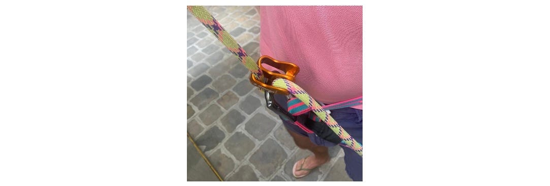 After the fire station said “NO” to helping us (Simon had asked them to ride by and extend their ladder on the street so that he didn’t have to ummm RISK HIS LIFE), Simon called his brother, mentioned above, who is the avid climber. At 6pm – we were on Matthieu’s doorstep being talked through what rope goes in what hole, how tight it should be, and with which hand to hold etc. (First of Simon’s family members who I was meeting and ahhhhh I was in spandex with ahhhh Fast and French branded blue, white and red knee high socks on as a joke for Simon and me. Ring the alarm! This was not the first impression I was going for. #AmericaninParis. All jokes aside. It was a great and hilarious first meeting.)