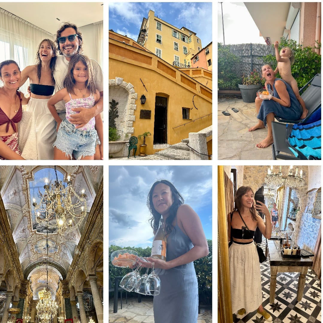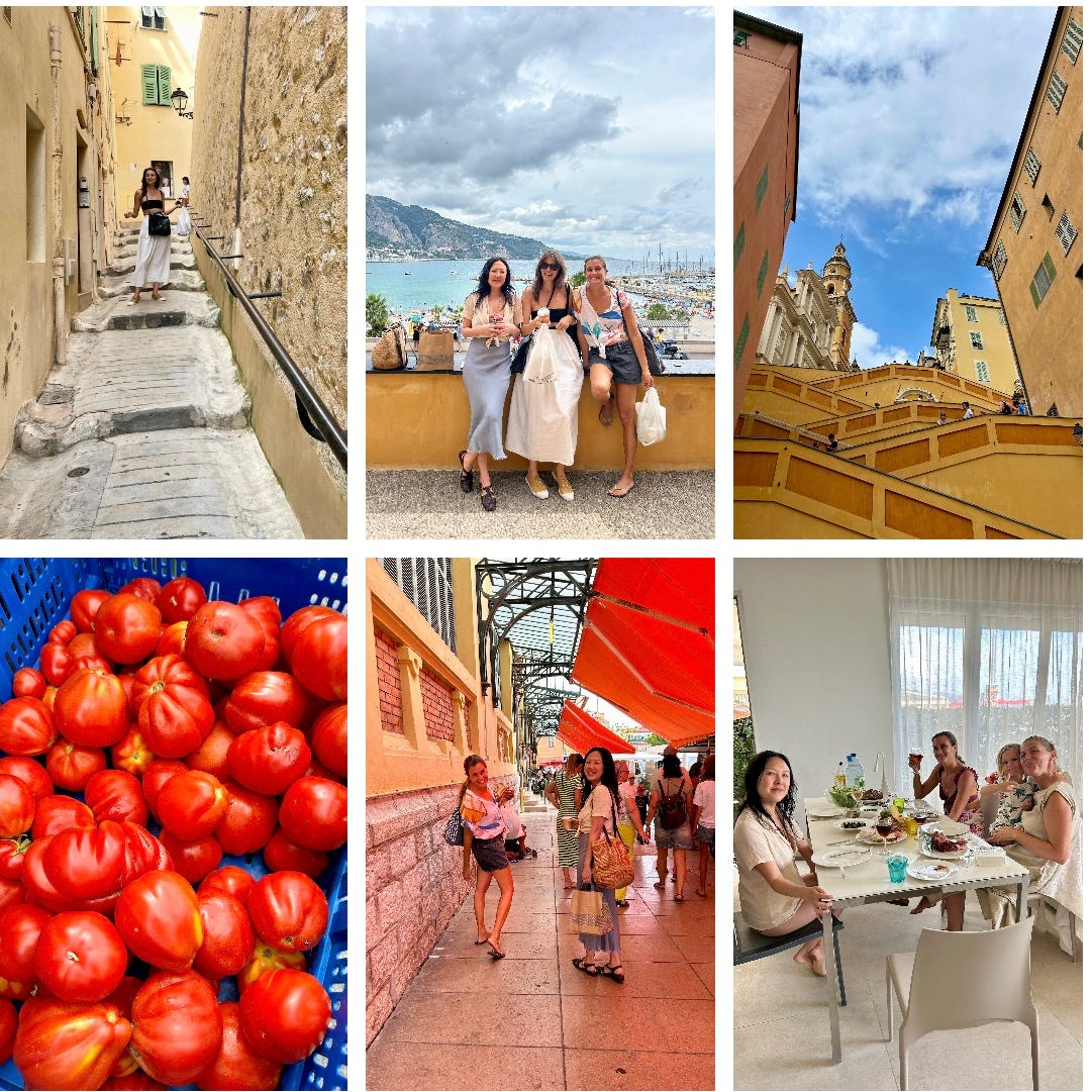 We took this time to open a bottle of rosé bubbles. A bottle that had a ladybug on her label… GREENLIGHT! We toasted our day together before we were off to Coté Sud where we had the BEST dinner and were treated like royalty. Everyone (seemingly no matter where we go in the world) knows Coni Malleville and Francesca Durante. Our dinner ended with all the tastes of Italian digestifs sent to the table along with a giggly walk home and ample souvenir lemon (what Menton is known for) magnets for all!