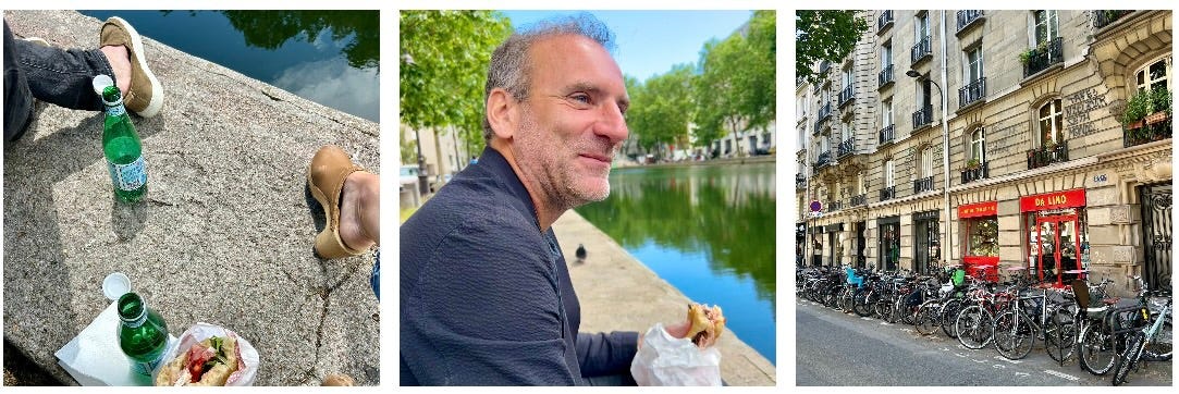 We have had a sweet few days together: A special dinner at home on the first night back, a bike ride on Friday to Da Lino for my favorite to-go focaccia sandwiches on the canal, a stop by his favorite Italian épicerie, Paìsano, a long Saturday run for moi to his tennis tournament, a mini tennis lesson after together indoors, an incredible and cozy dinner at his brother and sister in law’s beautiful home, and a visit to Château de Bagatelle rose gardens with a homemade picnic and wine.